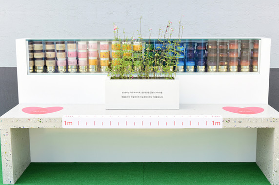 수거된 플라스틱이 다시 쓰레기가 된다면 의미가 없겠죠. 이니스프리는 수거된 공병을 활용해 '업사이클링 벤치'를 만들거나, 인조 대리석 마감재인 '테라초(Terrazzo)'로 재탄생시켜 매장 인테리어에 적용했습니다.